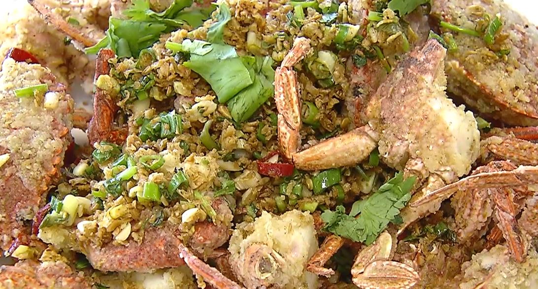 10兩大花蟹分解後擺盤,不加任何調味料,直接200度蒸8分鐘,肉甜膏濃郁,滿嘴都是海味。民眾:「清蒸的也不錯,它就是最原始的甜味。」如果想要重口味,也可以嘗試油炸過後,搭配蒜酥、辣椒爆炒的避風塘石蟳,鹹酥口感更能帶出鮮甜。