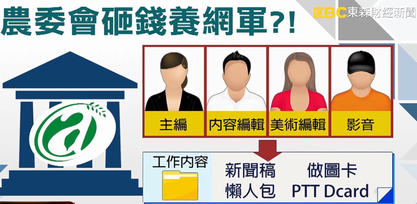 ▲農委會開出的外包標案,對外招募4個人,工作內容包含新聞稿、做圖卡、懶人包,甚至連在PTT Dcard等網站。(圖/東森新聞資料畫面)
