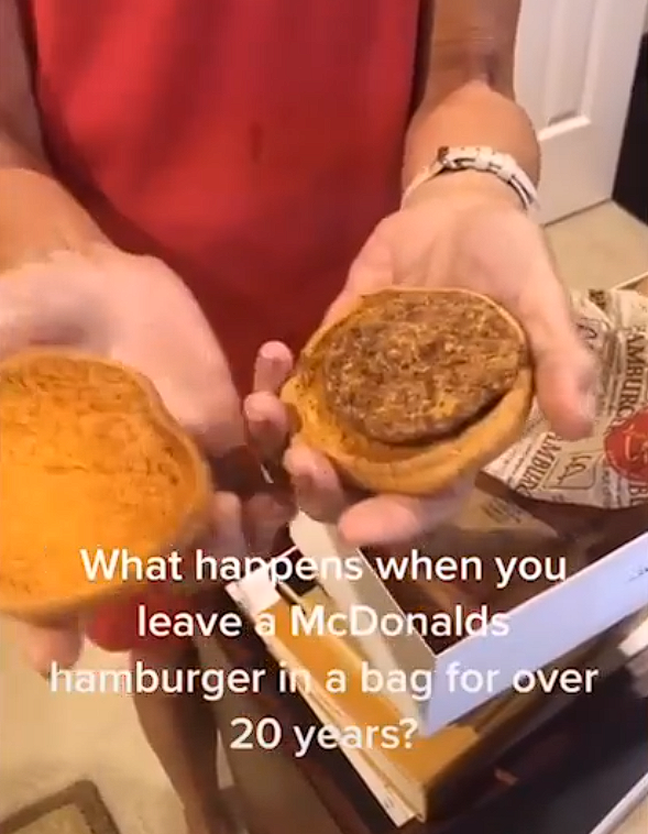 原來,影片拍的內容,正是她的奶奶拿出封藏在衣櫥裡長達24年的麥當勞漢堡和薯條。影片中,可看到老奶奶打開了一個側面寫著「漢堡」的白色鞋盒中,她打開鞋盒後,放著一個紙袋,漢堡就裝在這個紙袋中,令人驚訝的是,老奶奶指著紙袋上1996年納斯卡賽車比賽的廣告,說:「這就是漢堡生產的年份,到現在已經有24年的歷史了。」