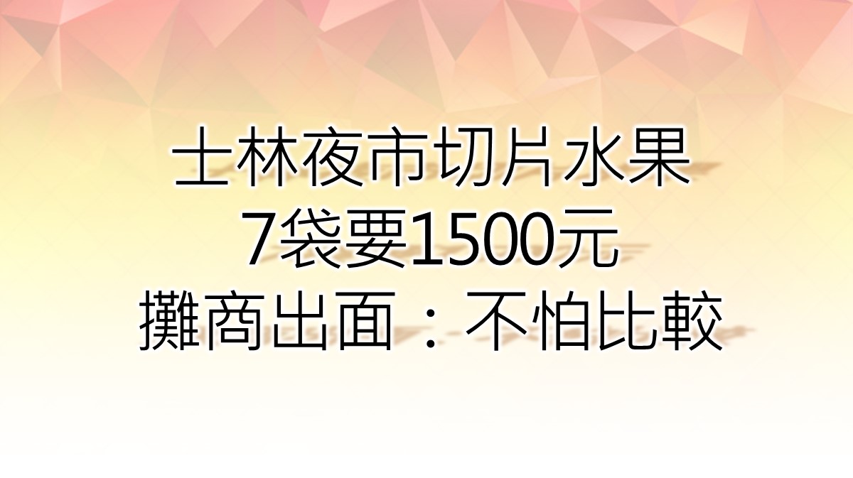 網友在《爆怨公社》po文稱韓籍友人在士林夜市一家切片水果攤買7種水果,沒想到結帳時卻結了1500元令人傻眼,根據《蘋果》報導,被投訴的水果攤老闆陳先生大方坦承,此次網PO的水果的確是在該攤位購買,他已在該點擺攤10多年,對於被投訴賣貴,他表示該攤水果都是最好等級,水果也給顧客試吃,現切服務、租金等也要算入成本中,大家卻只看到買什麼水果。他說大家可以拿去一般菜市場比較,「真金不怕火煉」。