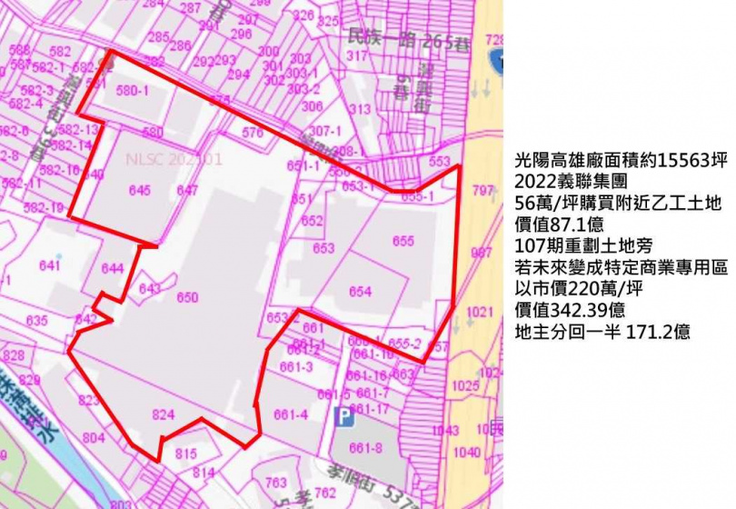 高雄市不動產代銷公會理事長謝哲耀表示,2022年義聯集團在光陽周邊以每坪56萬元行情買下附近的乙種工業用土地,以此推估目前光陽總部土地市值為87.1億元。「假使未來比照一旁107期重劃土地之條件,變更成特定專用區、地主可分回5成,以目前市值每坪220萬元來看,未來分回土地市值起碼171.2億元。」