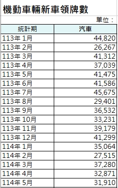根據監理站統計,今年4月以來全台新車領牌數持續衰退,3月還有3萬7280輛,4月減至3萬2871輛,月減11.83%,更較去年4月的3萬7039輛衰退11.26%;5月新車領牌數更進一步衰退至3萬1910輛,月減幅拉大至2.92%,更較去年同期的4萬1475輛衰退23.06%。