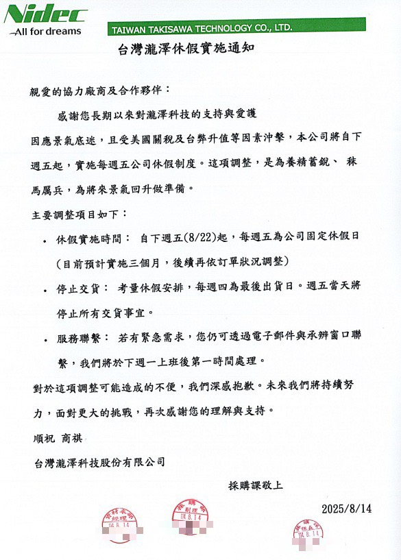 在川普放話實施對等關稅及台幣強升的期間,不少業者出面透露,利潤所剩無幾,恐怕撐不下去,而據網路上流傳的照片顯示,瀧澤科採購課於上週四(14日)發布「休假實施通知」,全文如下: