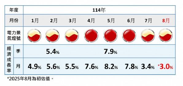 台綜院並預測,2025年8月台灣經濟成長率約為3.0%,與7月的3.4%相差不大,整體經濟維持溫和擴張。不過,報告也再度提醒,若傳產景氣持續低迷,恐對長期結構造成隱憂,政府與產業應積極尋求轉型契機,以避免兩極化持續擴大。