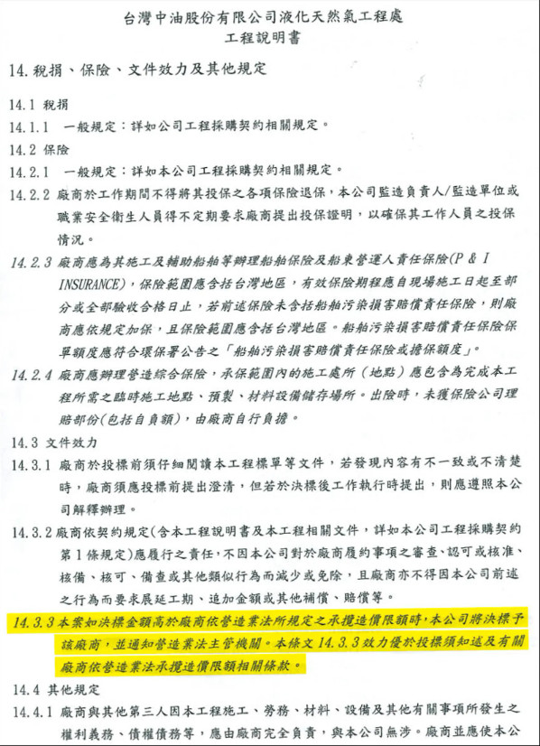 依照《營造業法》規定,廠商只能承包資本額10倍以下標案,以確保廠商具有應的資力與風險承受能力,沒想到中油在招標過程臨時更改內規,讓資本額不足的東丕營造取得投標資格,東丕董事長王銀和的一段錄音檔,恰巧證明中油有意護航東丕搶奪台電四接千億大餅,其中有無期約對價?有待檢調廉釐清。至於中油三接工程是否涉嫌浮報經費,經檢廉比對七接承包價,工程難度更高的三接與七接總經費相仿,已初步排除浮報的可能。