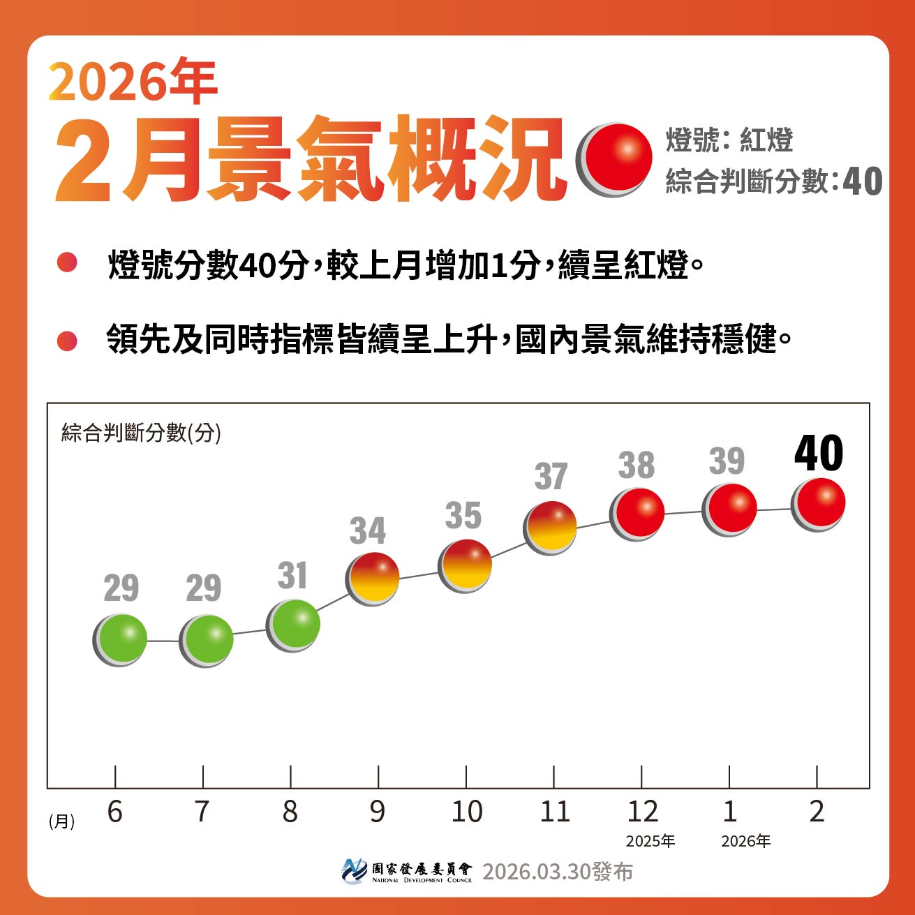 2月景氣對策信號綜合判斷分數達40分,燈號續呈紅燈。受惠AI強勁需求,加班工時轉紅,領先指標持續上升,顯示臺灣經濟在半導體與數位轉型驅動下,正展現極具韌性的成長動能。