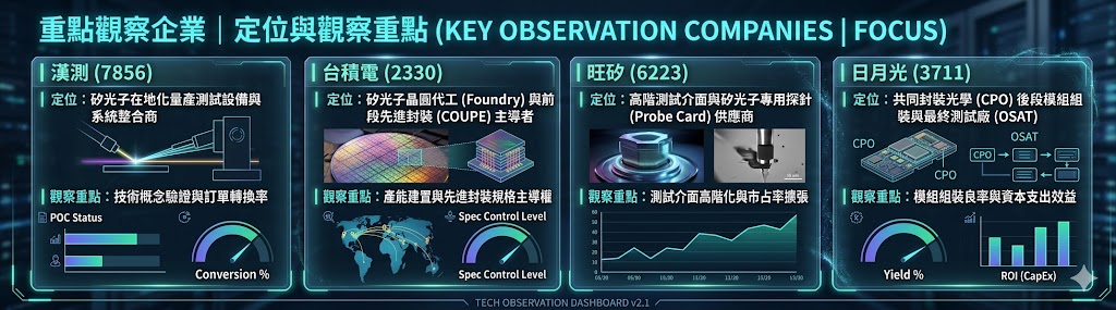 口袋證券提醒,矽光子屬於高度客製化的先進封裝技術,投資人須留意廠商是否已取得大型CSP(雲端服務供應商)或AI晶片龍頭的量產訂單。在題材發酵初期,股價波動通常較大,建議避開僅具研發題材但無實質營收貢獻的標的,並配合法說會釋出的「良率改善時程」作為長線布局參考。在重點觀察企業方面,漢測(7856)作為在地化量產測試設備整合商,技術驗證與訂單轉換率是觀察要點;台積電(2330)主導晶圓代工與COUPE先進封裝,應關注其產能建置;旺矽(6223)則以專用探針卡供應商角色觀察其市占擴張;日月光(3711)作為後段模組組裝與最終測試廠,其模組組裝良率與資本支出效益將是關鍵指標。
