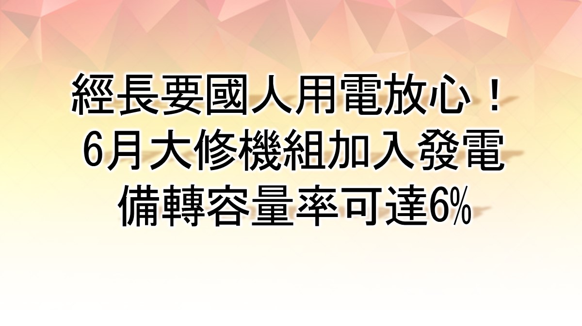 連日高溫,用電量狂飆,今 (30) 日瞬時尖峰負載達 3677.14 萬瓩,創史上最高用電量,也是首次在 5 月打破用電量紀錄,經濟部長沈榮津表示,預估 6 月大修的機組會回來加入發電,預計機組可維持正常,備轉容量率可恢復到 6%,讓國人安心放心,6 月的供電壓力也會減輕一點,目前並不會啟動公部門節電措施。