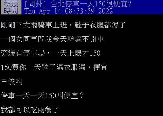 該名網友是在論壇PTT上發文,主要想詢問網友們對於台北市停車費的看法。他表示,自己之前有一次下大雨仍騎車上班,無可避免的被淋得一身濕,進公司後同事看到他如此狼狽,不解原PO為何不開車上班?同事還說,公司旁邊停車場一天150元,花150元買一天鞋子和衣服的乾爽「很便宜」。但對於同事的說法,原PO卻深感不以為然,認為150元足夠自己一天吃兩餐的開銷,不解為何「停車一天150叫便宜?」