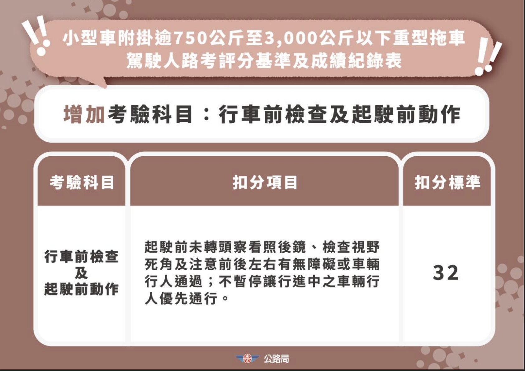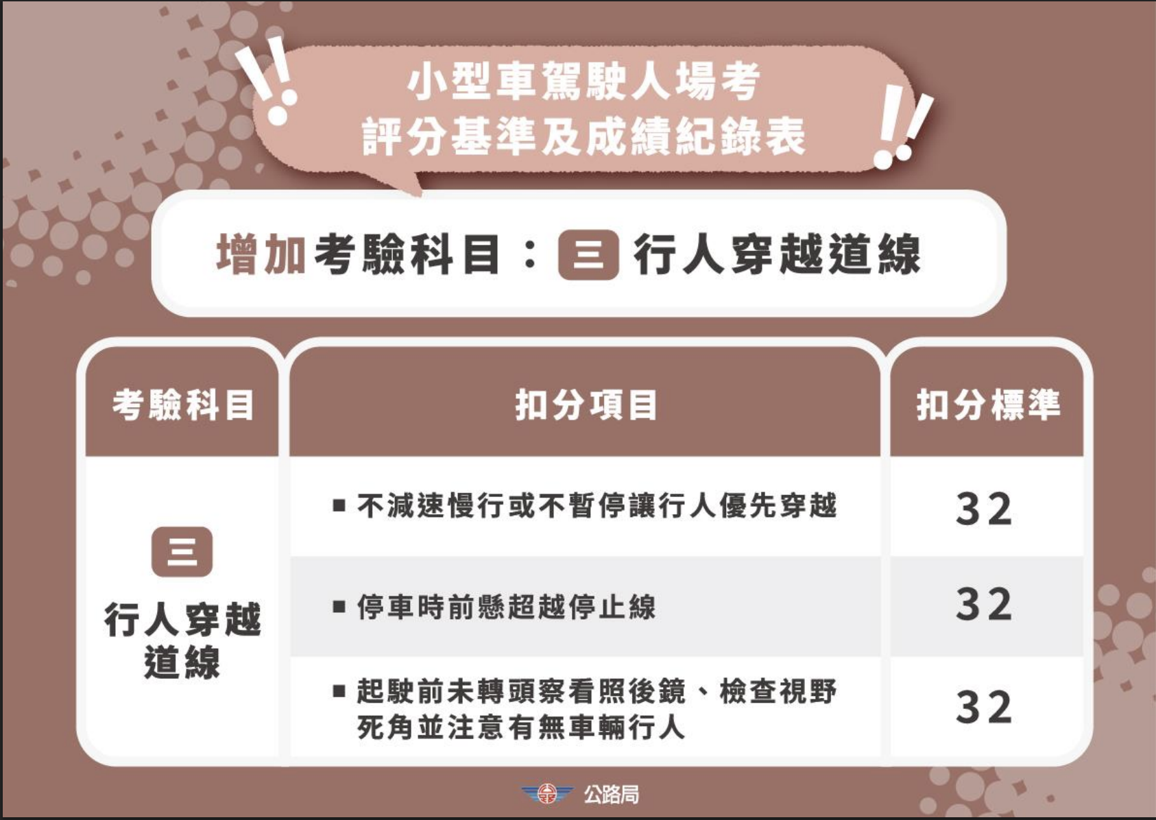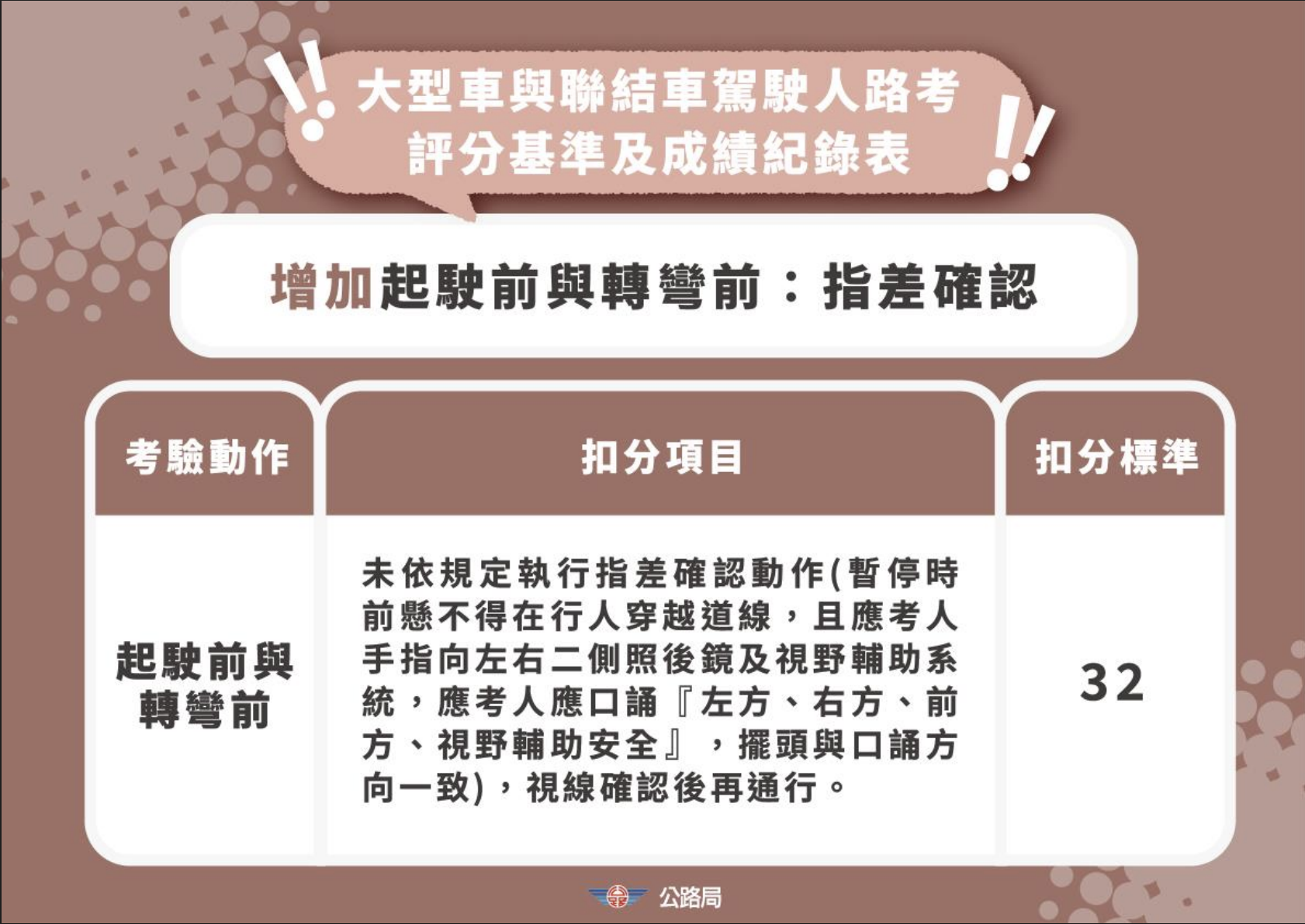 公路局表示,為落實以人為本的交通理念,自115年1月起已要求駕訓班將停讓行人、視野死角確認及大型車指差確認列為標準化教材。自115年3月31日起,這些項目正式納入場地考試評分基準。小型車駕駛若行經行人穿越道未減速停讓,或在起駛、轉彎前未執行視野死角確認,將直接扣32分。大型車要求更為嚴謹,駕駛人必須在起駛及轉彎前執行「指差確認」,需擺頭、手指兩側後照鏡、前方視野與輔助系統並口誦,若未確實執行同樣一次扣32分。