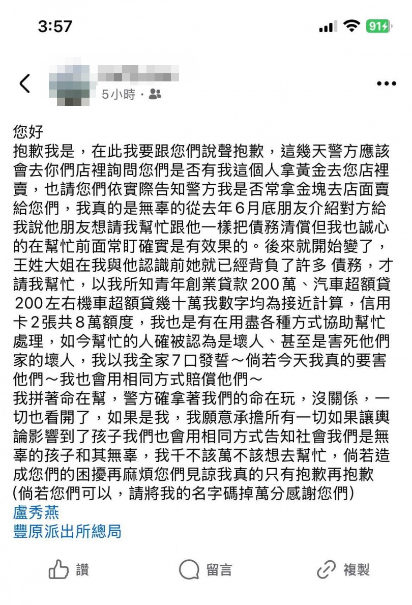 台中豐原區一家五口因捲入黃金投資詐騙案走上絕路,涉案的李姓女團購主昨(6日)以15萬元交保後,隨即在網路發文堅稱自己無辜,強調認識王家大女兒時對方早已負債累累,自己「用盡方式幫忙清償」,甚至以全家七口性命發誓,反控警方「拿著我們的命在玩」。然而,這番言論立刻遭王家大女兒的好友強力駁斥,怒轟:「害死一家五口!妳還想出來狡辯!妳以為妳逃的了嗎?」