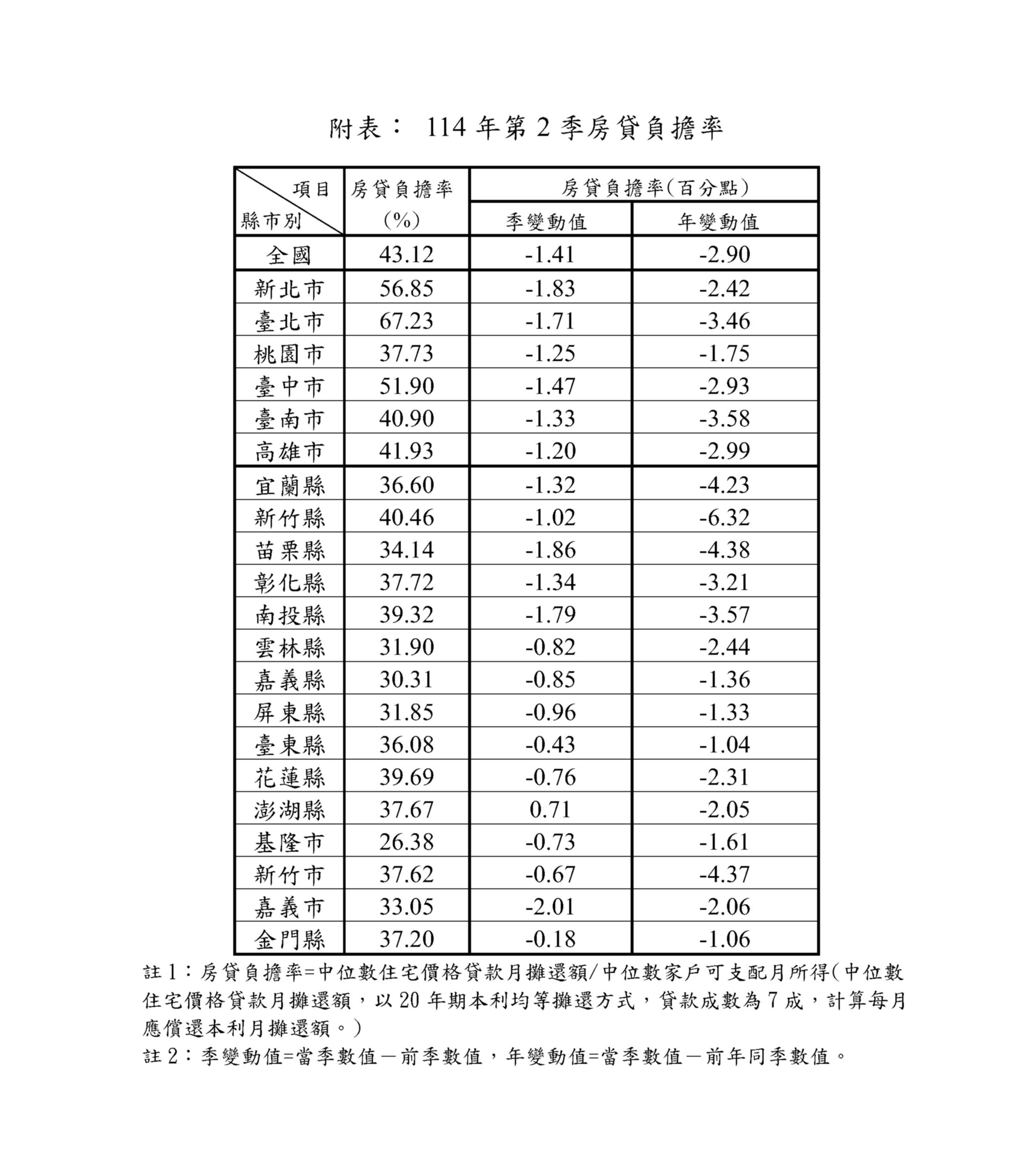 在價格滑落與所得成長的雙重作用下,本季全國房貸負擔率下降至43.12%,較上季減少1.41%,創下連續第三季下跌。內政部指出,中位數住宅價格從1000萬元降至980萬元、跌幅2%,使負擔率降低約0.89%;家戶可支配所得從97.67萬元提升至99.14萬元,增加1.51%,進一步使負擔率減少0.66%。雖然五大銀行新承做房貸利率微升至2.282%,推高負擔率約0.14%,但整體仍呈下降。