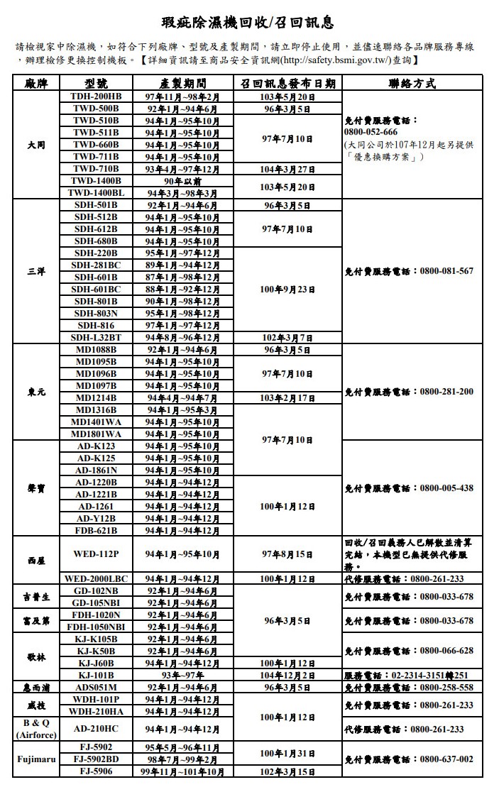 ▼經濟部標準檢驗局提供瑕疵除濕機回收、召回訊息,12個知名品牌,54款機型快停用。(圖/翻攝《經濟部標準檢驗局》官網)
