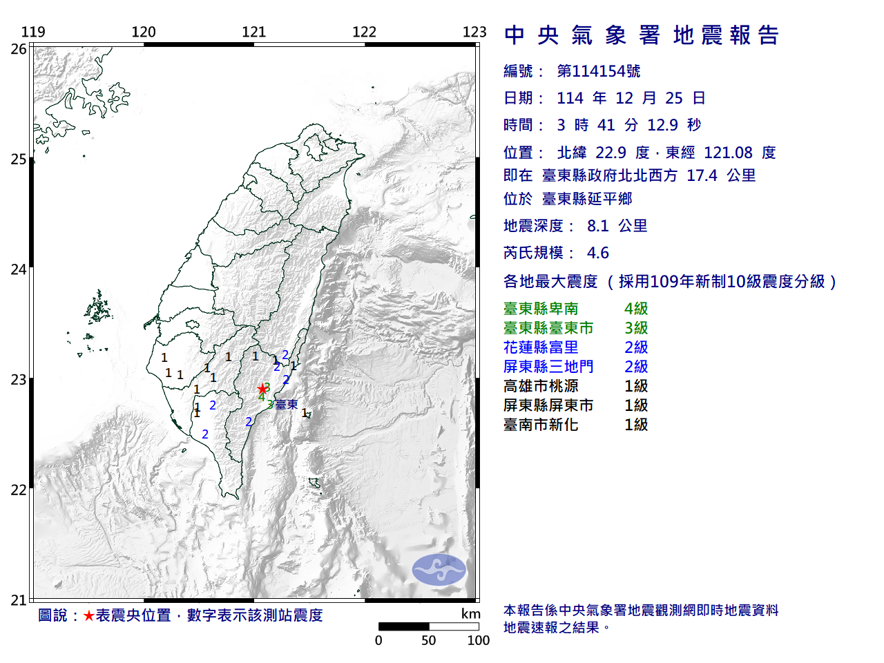 中央氣象署發布顯著有感地震最新消息,今(25)日3時41分,發生芮氏規模4.6有感地震,震央位置在臺東縣政府北北西方 17.4 公里 (位於臺東縣延平鄉),震源深度8.1公里。