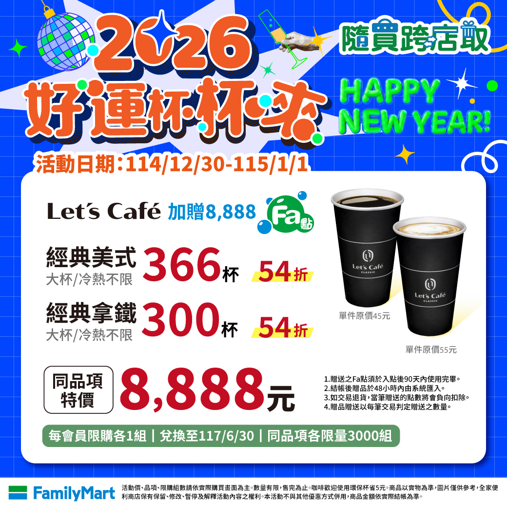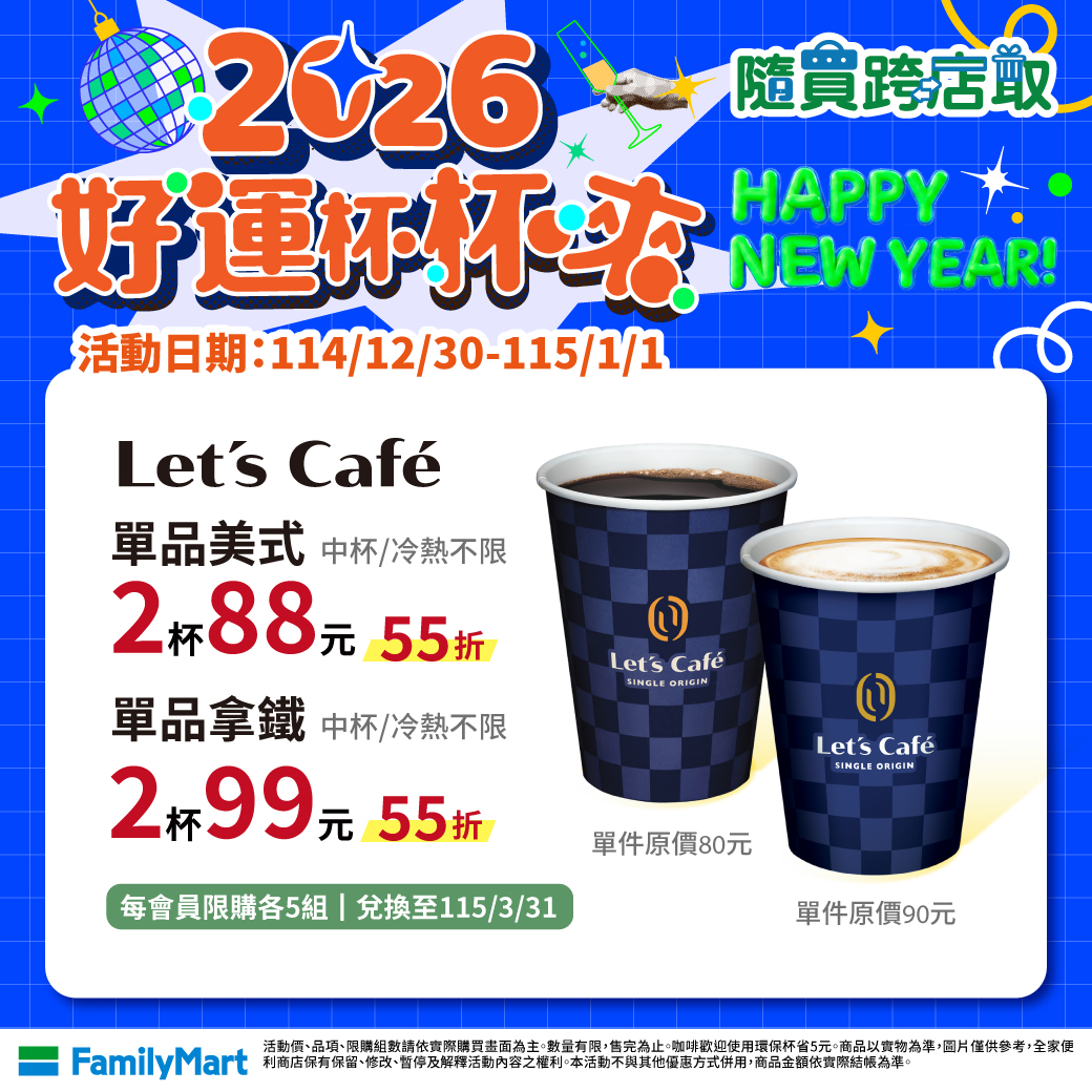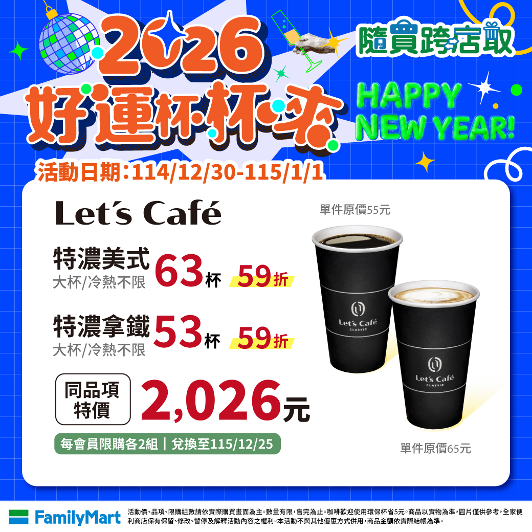 備戰跨年夜與元旦!4大超商祭出多項優惠,7-ELEVEN在APP推出特選與精品美式、拿鐵「買7送7」,全家推出Let’s Café「2026元跨年囤杯組合」;萊爾富推出同品項「第2杯5元」優惠;OKmart則推出同品項「買2送1」,愛喝咖啡的別錯過!