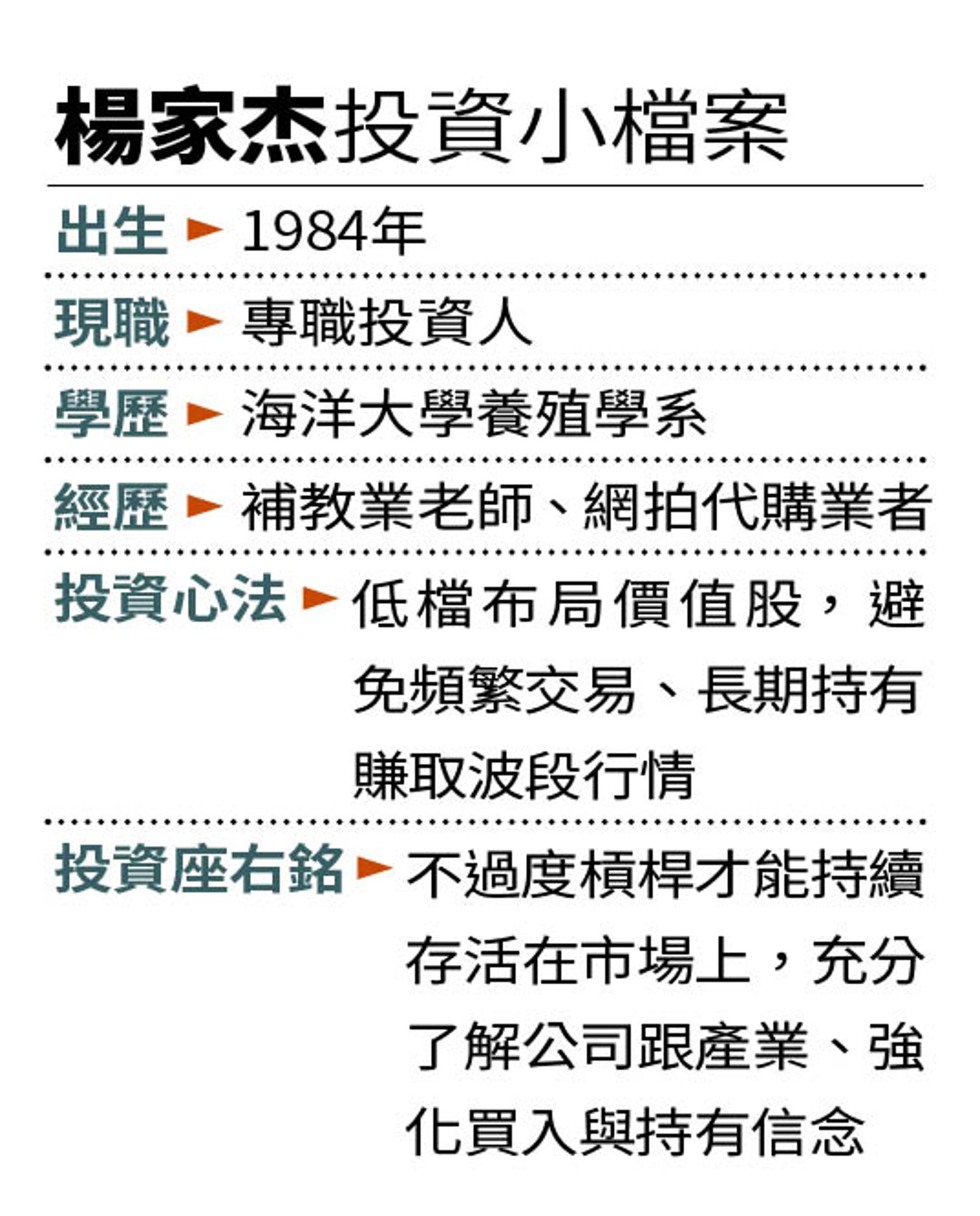 「分散風險等於分散報酬,趨勢向上就該集中火力。」41歲的楊家杰戴著粗框眼鏡,給人樸實低調的印象,很難想像10年前他是位月領3萬5千元的補教老師,如今資產破億。