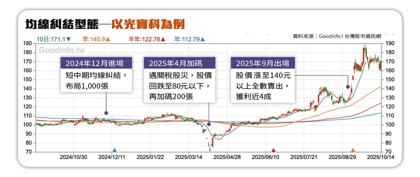 以眾達--KY為例,去年6月短中長期均線出現糾結,此前量縮長達近一年,籌碼乾淨,加上產業趨勢確立,所以他在當年7月花2天進場布局,總共買進約850張,平均成本80元。