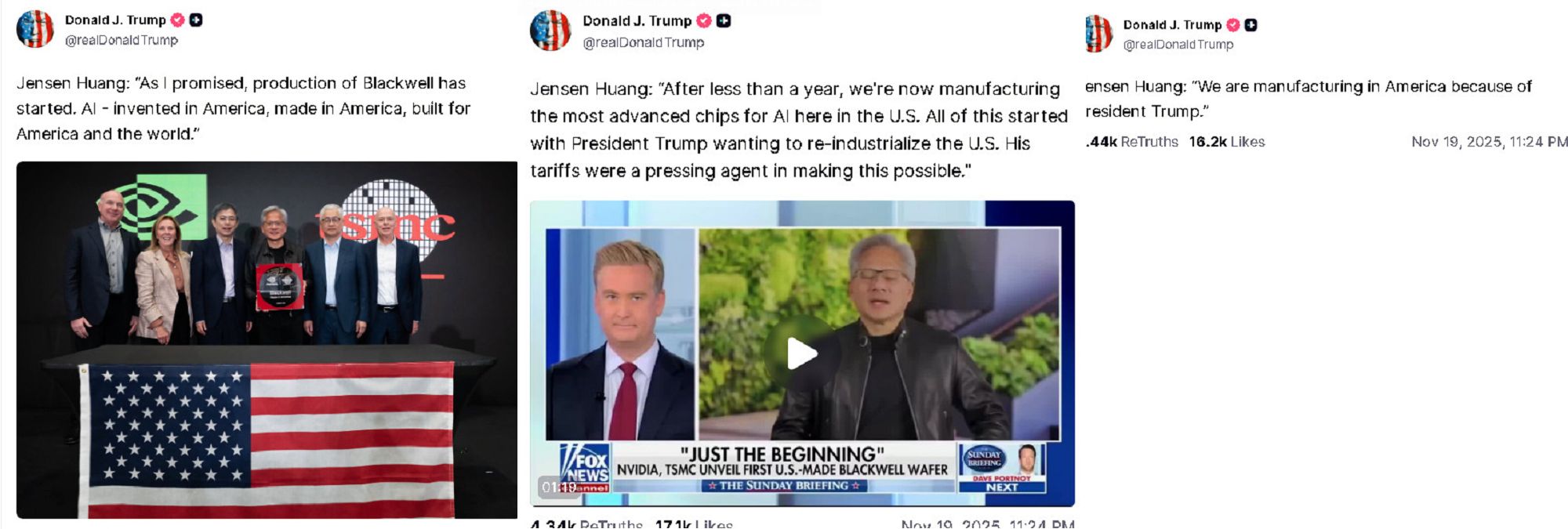 川普轉貼的內容包括黃仁勳強調,輝達最先進的AI晶片「Blackwell」已開始生產,且「在美國發明、在美國製造,為美國與全世界打造」。並提到不到一年時間,美國已開始生產最先進AI晶片,關鍵動力正是川普推動的產業再工業化與關稅政策。此外,黃仁勳更直言:「我們之所以能在美國生產,是因為川普。」