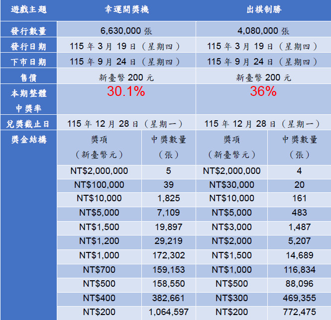 ▼「幸運開獎機」、「出棋制勝」刮刮樂中獎機率。(圖/台彩公司提供)