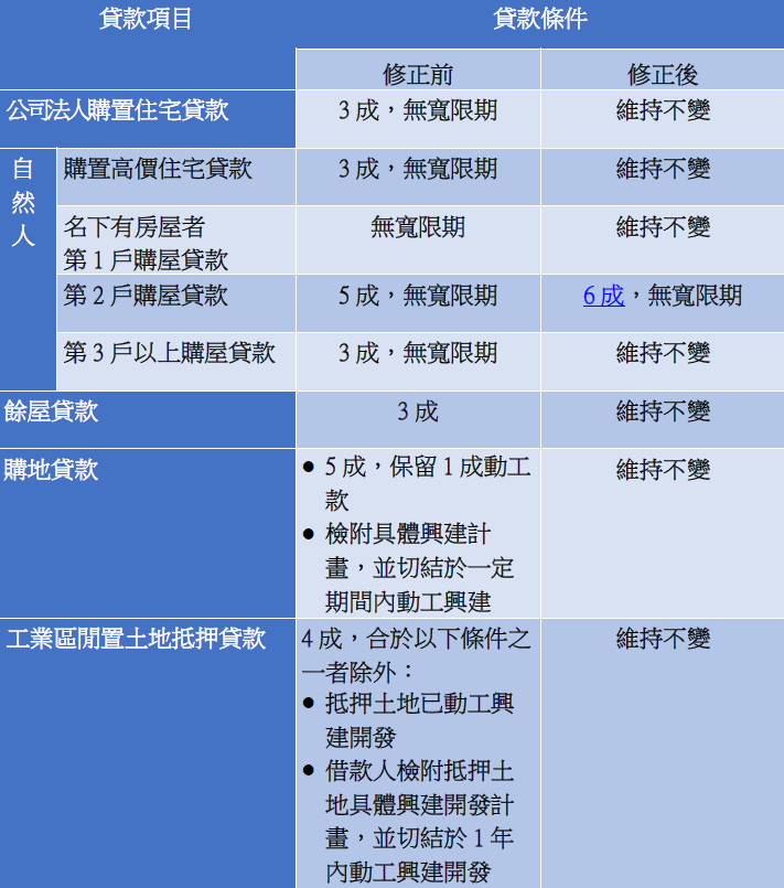 為因應房市降溫與金融穩定需求,中央銀行於3月19日召開理監事會議,宣布調整選擇性信用管制措施,將自然人第2戶購屋貸款成數上限,由原先5成提高至6成,並自3月20日起正式實施。此舉被市場解讀為在嚴格管制下的「微解封」,為近期低迷的房市注入一絲活水。