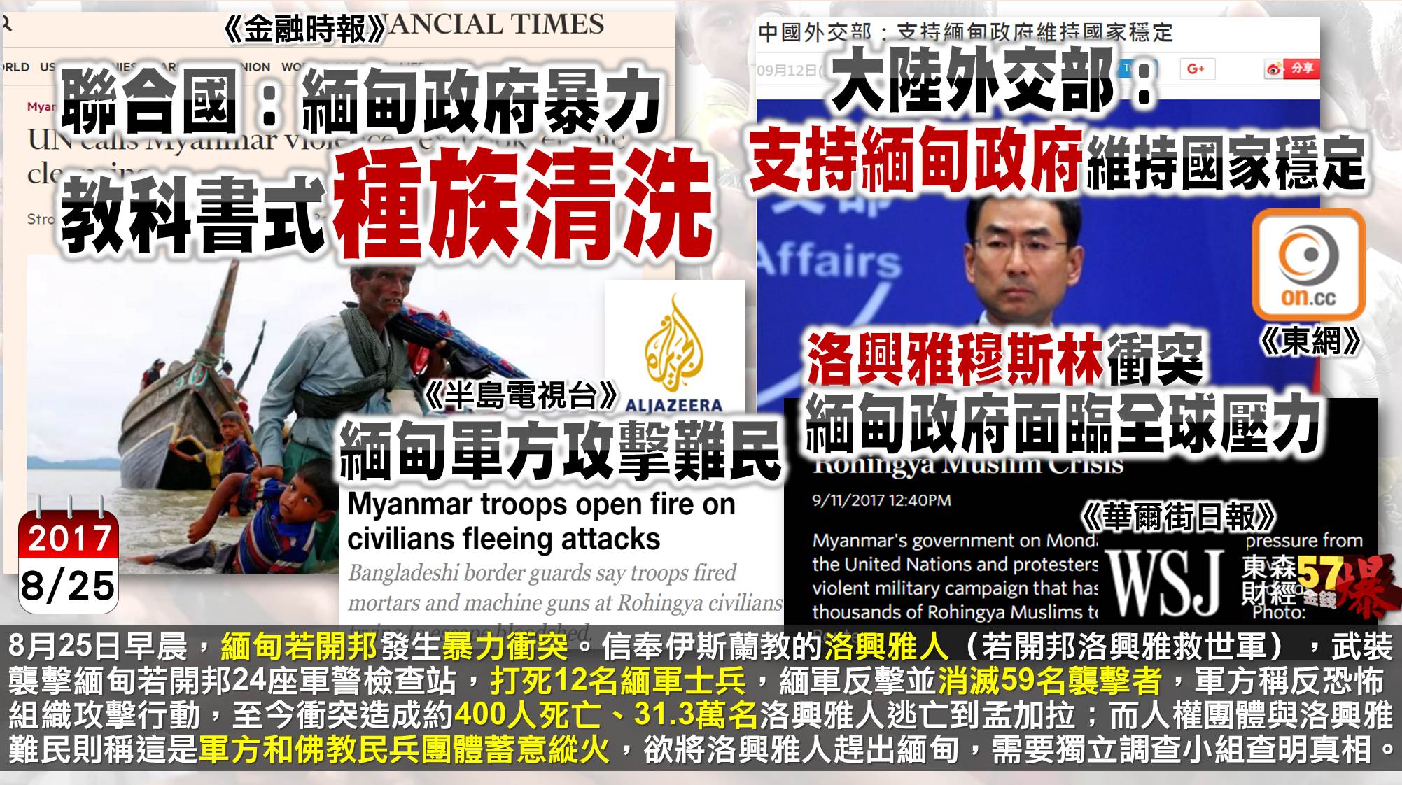 8月25日緬甸政府軍在洛興雅人聚居的西北部若開邦,與反政府武裝若開洛興雅救世軍交火,造成400人死亡。緬甸政府聲稱,洛興雅人在當地製造「恐怖活動」,迫使軍隊出動反恐。有人權組織警告,軍方行動近乎種族清洗。當國際援助組織欲向若開邦地區運送人道物資時,軍方以安全理由封鎖衝突區,還禁止聯合國調查團及外國媒體進入區域採訪。這聽起來像是軍政府獨裁時期才會發生的荒唐事,卻是諾貝爾和平獎得主翁山蘇姬治理下的慘況。