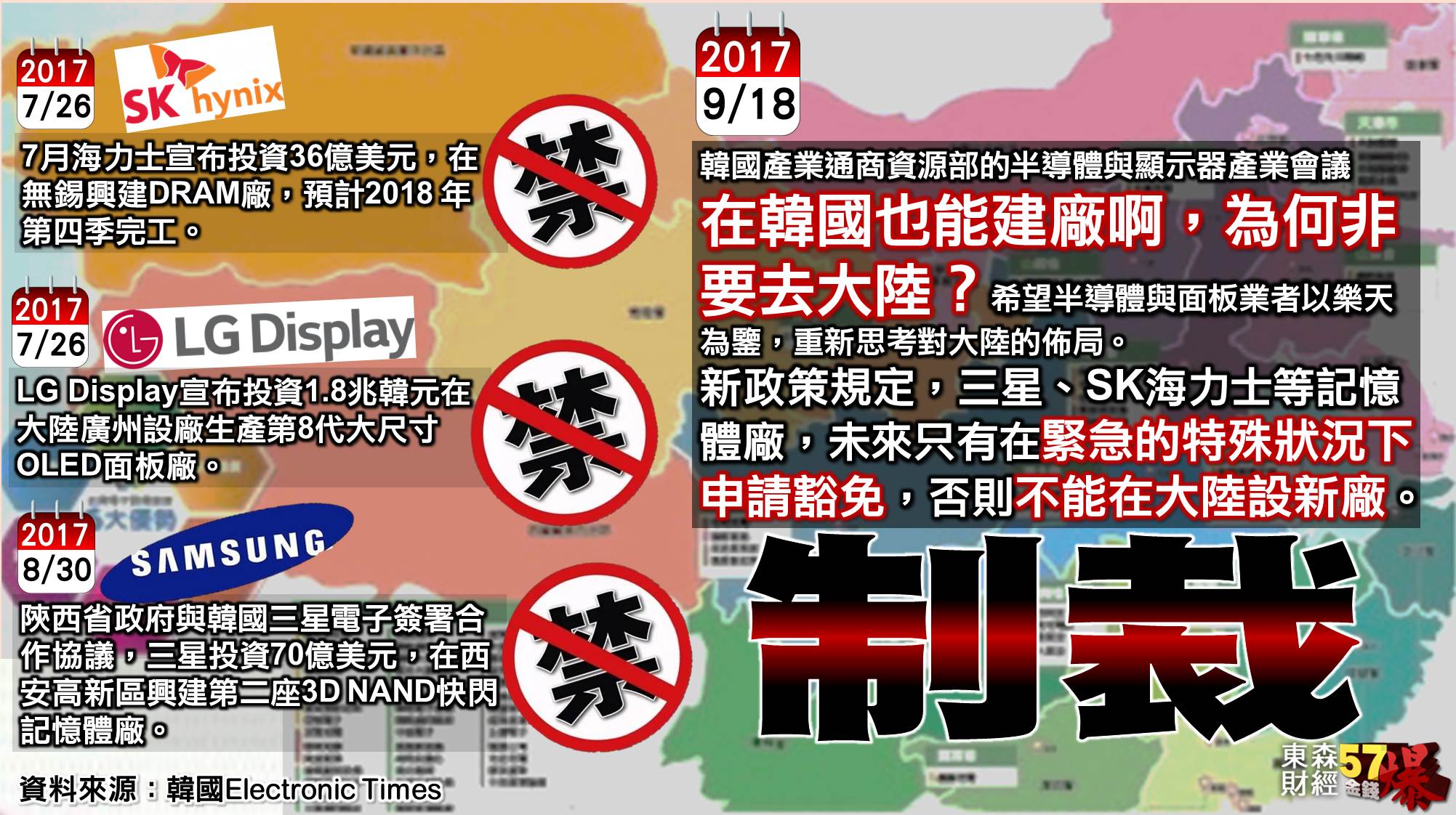 在9月18日韓國禁止半導體跟面板產業到大陸擴廠,說的冠冕堂皇一點就是,避免先進技術外流而喪失競爭優勢,但其實是韓國的民族心大爆發,針對薩德危機祭出對大陸產業報復的政策,而且就針對大陸產業的軟肋半導體。為因應這次韓國的政治報復禁令,以大陸的立場來看最大的對手走了,當然更要加快半導體進程,而傷害最大的卻是台灣半導體產業。