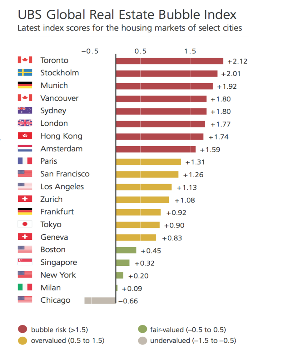 由於全球經濟增長改善、低失業率和超低利率等因素推高了資產價格,有關資產泡沫的擔憂也再度升溫。據瑞銀所研究的城市中,有四分之三位於泡沫風險或估值過高區域,唯一估值偏低的城市則是芝加哥。