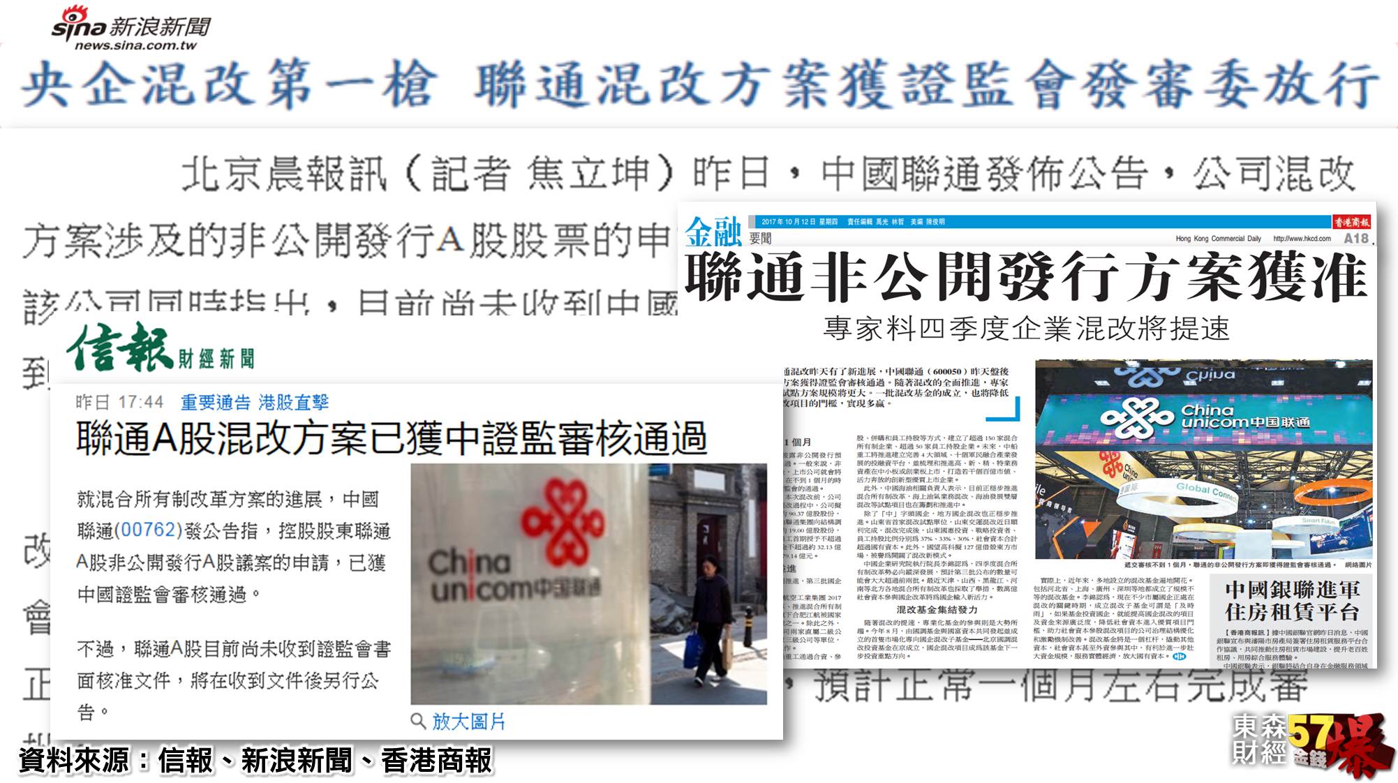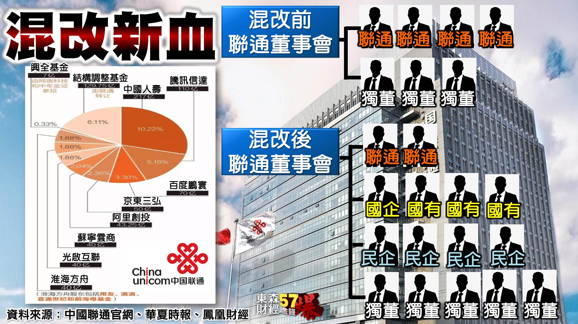 想想,面對民間企業富豪拚命坐大,利用混改就可以把民企的資金吸收進國企,將國企做大,這一點,在中國聯通的混改就得到證明;中國聯通在大陸三大電信商當中,算是最弱的那一個。用戶數、基地台、營收等等都輸給中國移動和中國電信,現在正好藉著混改東風吹得正盛,至少BATJ(百度、阿里巴巴、騰訊、京東)等大陸幾四大互聯網公司每家都投入幾十億甚至百億人民幣入股中國聯通,先不說是不是把國企變強大了,但是至少已經先做大。