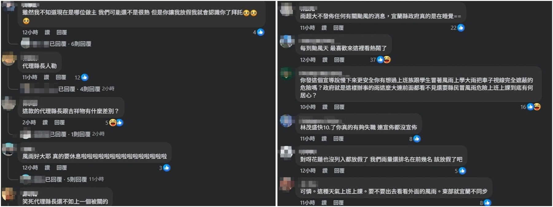 宜蘭縣政府官方臉書最新貼文並未提及颱風相關事宜,而是在談交通,因此湧入憤怒的民眾,「粉專要不要改名?改成宜蘭沒政府」「代理縣長人勒」「這款的代理縣長跟吉祥物有什麼差別?」「笑死代理縣長還不如上一個被關的」「雨超大不發佈任何有關颱風的消息,宜蘭縣政府真的是在睡覺==」「要不要看一下今天的風雨,一點表示都沒有,真的可悲」「別都去上班上課了,才宣布停班停課,會很ooxx」「騎到都看不到路了還不停班停課 全身都濕了 到底是怎樣==」「還是之前林姿妙縣長比較好」「代理縣長起床沒,此時此刻全部宜蘭人都想罵你」。