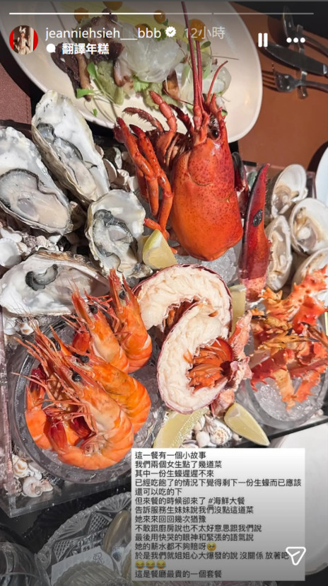 ▼服務生送成最貴的海陸大餐,緊張到快哭了。(圖/翻攝謝金燕IG)