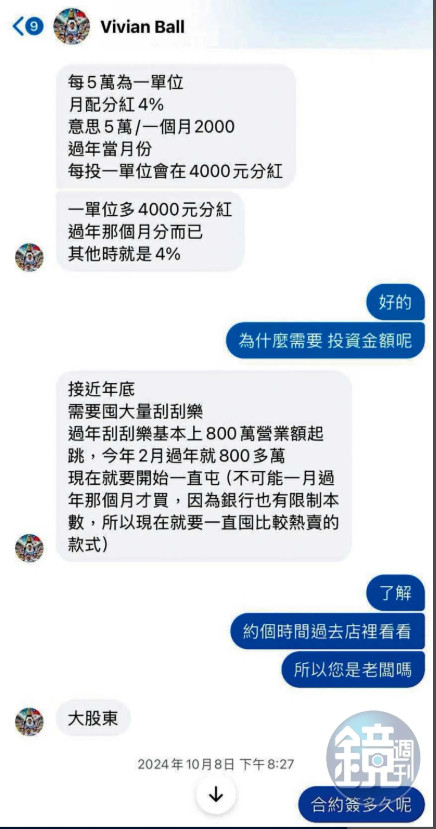台中A小姐告訴本刊,前年10月想找人合夥開服飾店,楊彗琪透過臉書私訊她,聲稱是彩券行大股東,為因應春節刮刮樂需求,要找人集資囤貨,每單位5萬元,每個月可以分紅4%,過年當月還有額外紅利,希望A小姐出錢投資。