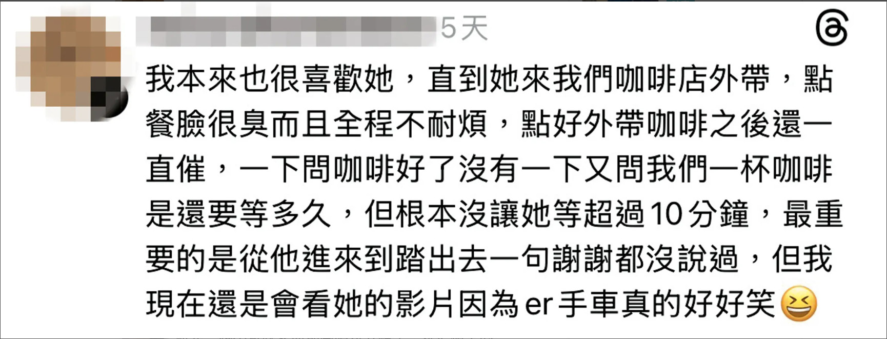 ▼咖啡店員工透露Melody外帶時不僅表情不耐煩,且連一句謝謝也沒說過。(圖/翻攝自Threads)