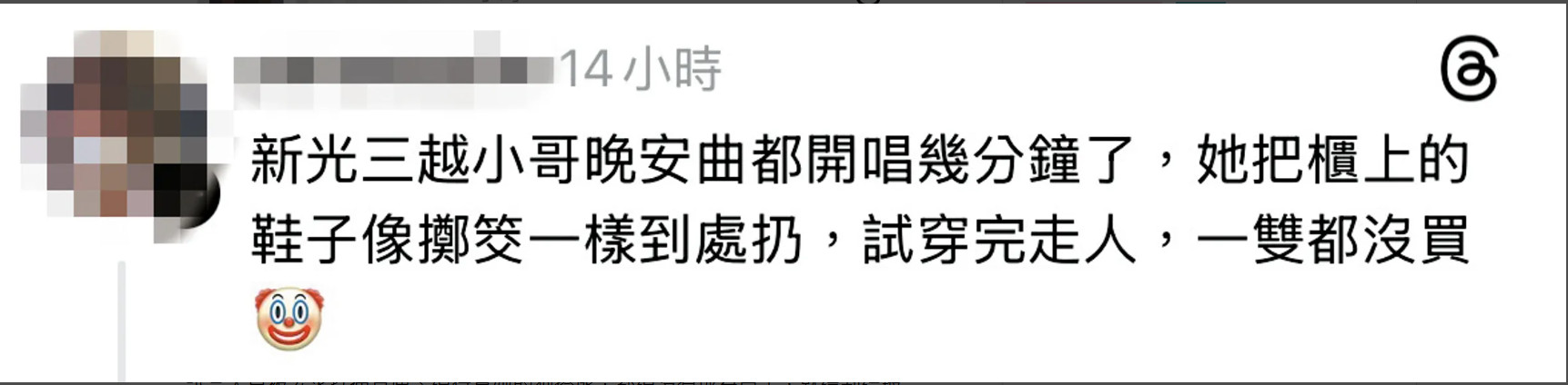 ■百貨業人員爆料,Melody試鞋後像「擲筊」一樣亂扔。 (圖/翻攝自Threads)