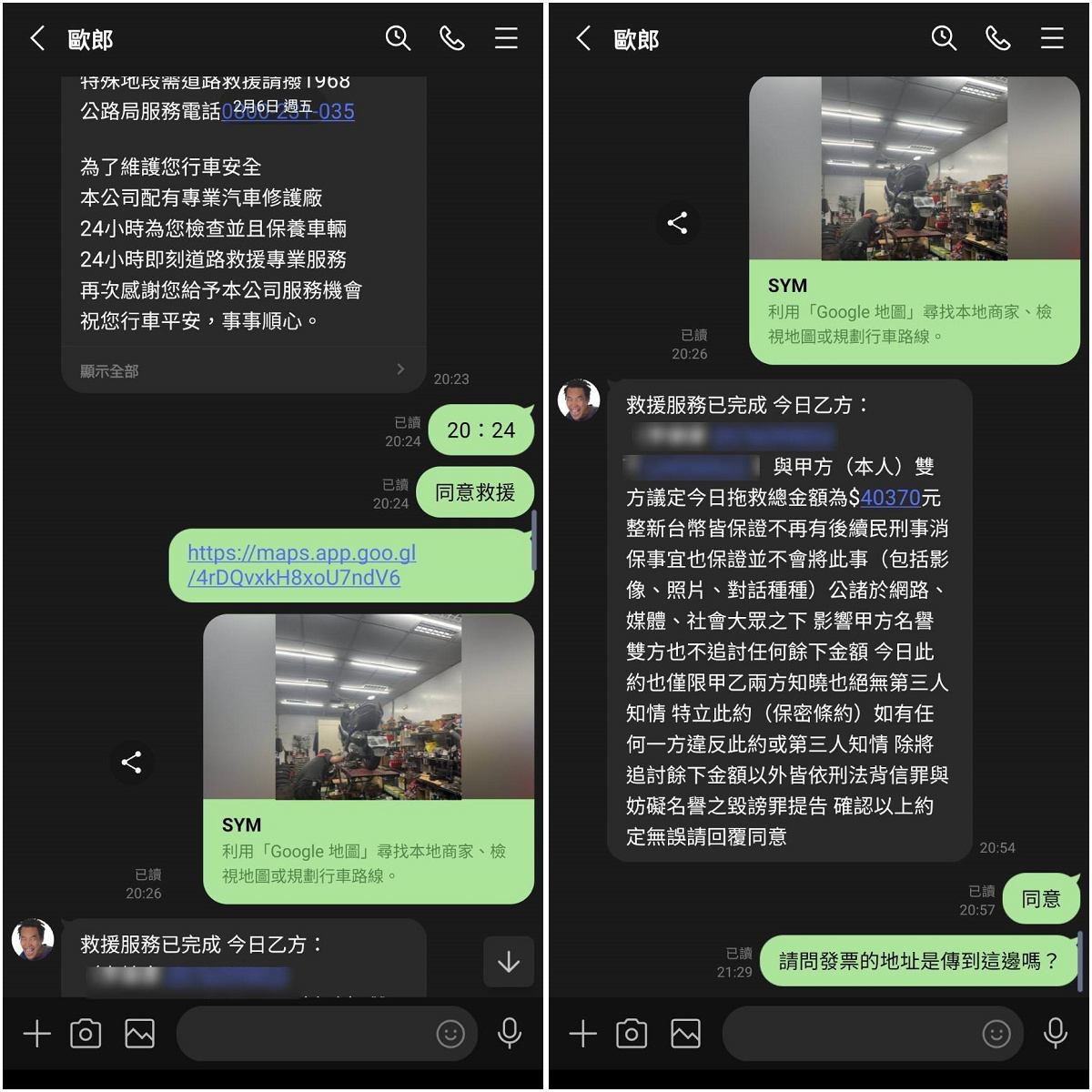 L男回憶,拖吊業者派員到場後,其中1人主動與他加LINE,傳遞長達2千多字的「汽機車道路救援(運送)服務契約簽認表」,並要求他傳訊回覆「同意救援」,後續才開始將車輛上架。