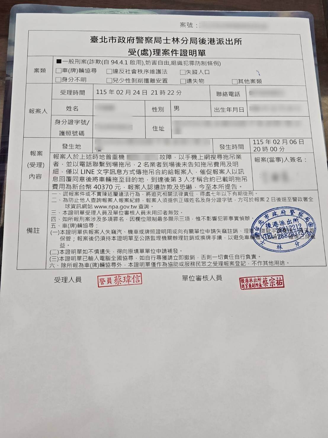 後續看到媒體大肆報導,發現烏來、桃園2案的拖吊車與當天他所委託的業者車號相同,加上北市議員陳宥丞有在臉書PO文曝光此事,因此主動傳訊向他求助,而後續派出所也在前天(24日)聯繫他到派出所製作筆錄,正式向「拖吊蟑螂」提告恐嚇、詐欺。