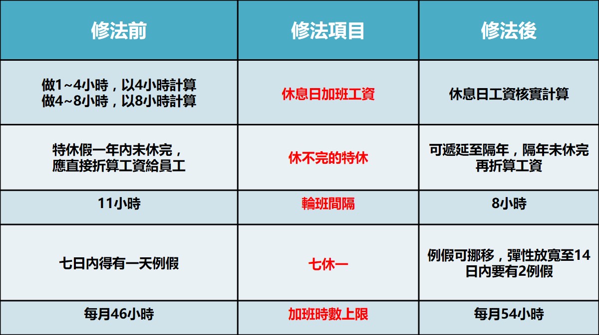 行政院長賴清德拍板一例一休5大修法方向,本週四(11月9日)政院將通過草案,包括休息日加班核實計算,特休假可遞延一年、輪班間隔由11小時縮為8小時、鬆綁7休1變14休2,加班上限由每月46小時提高至54小時。這五大修法方向獲得企業主贊同,不過勞團認為修法傾向資方, 連一例一休最核心的七休一都不要了,讓勞權倒退30年。到底一例一休修法前後有如何不同,請看以下懶人包整理: