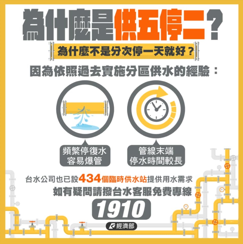 經濟部今天在臉書釋疑,指依照過去經驗,若採用分多次、停1天的方式,水管容易在頻繁停復水的情況下爆管,而管線末端復水時間往往會有延遲,也可能造成位在管線末端民眾停水時間較長。