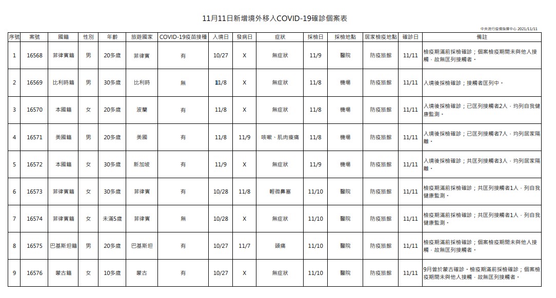指揮中心今(11)日召開疫情記者會,公布國內新增9例境外移入個案,為4例男性、5例女性,年齡介於未滿5歲至30多歲,其中7例接種過疫苗,6例屬突破性感染。