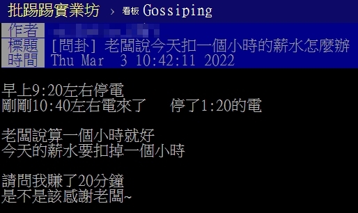 甚至有網友在PTT抱怨,公司在上午9點20分左右停電,直到10點40分才恢復正常供電,前後總共停電1小時20分鐘,結果老闆竟說,今天的薪水要扣掉1小時,讓原PO超傻眼,也忍不住自嘲「請問我賺了20分鐘,是不是該感謝老闆?」