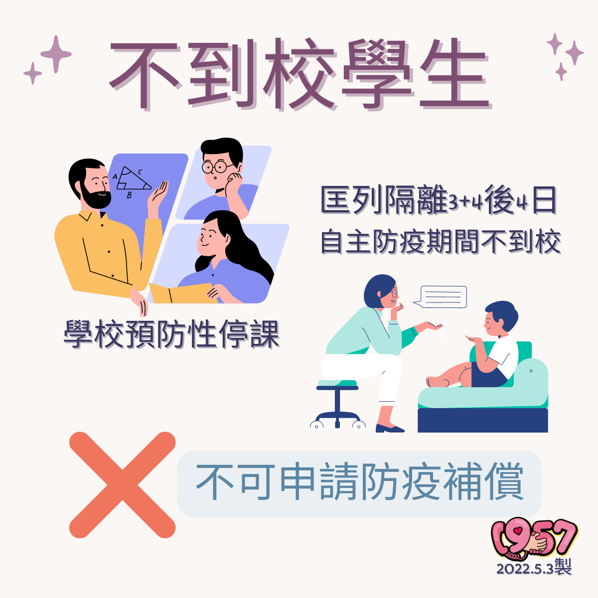 衛服部指出,防疫補償是針對限制人身自由之補償措施,持有個案接觸者居家個別隔離通知書、符合申請資格者,可申請本人、照顧者防疫補償,但是「自主防疫」、「自主健康管理」、「預防性停課」不可申請防疫補償,確診者隔離治療、確診者居家照護也不可申請。