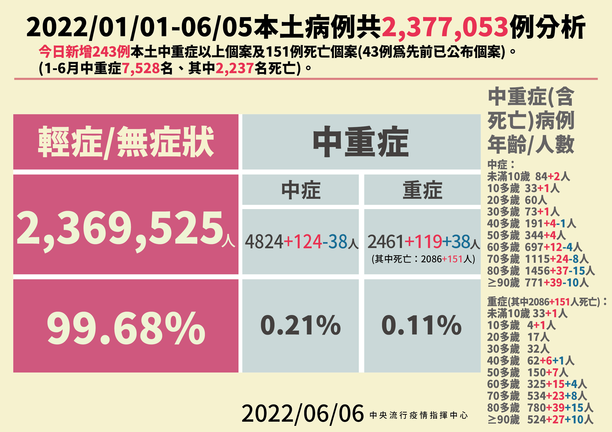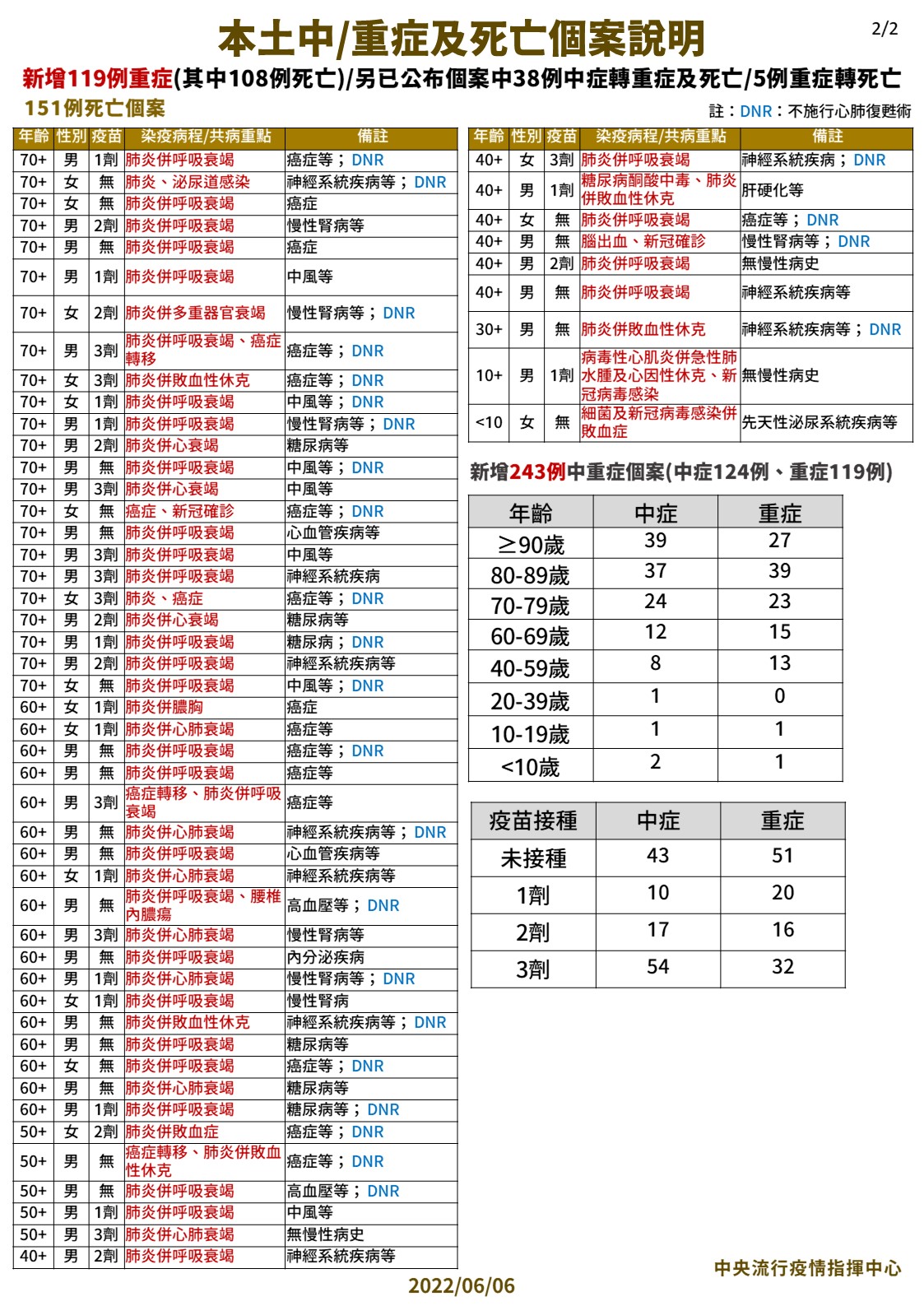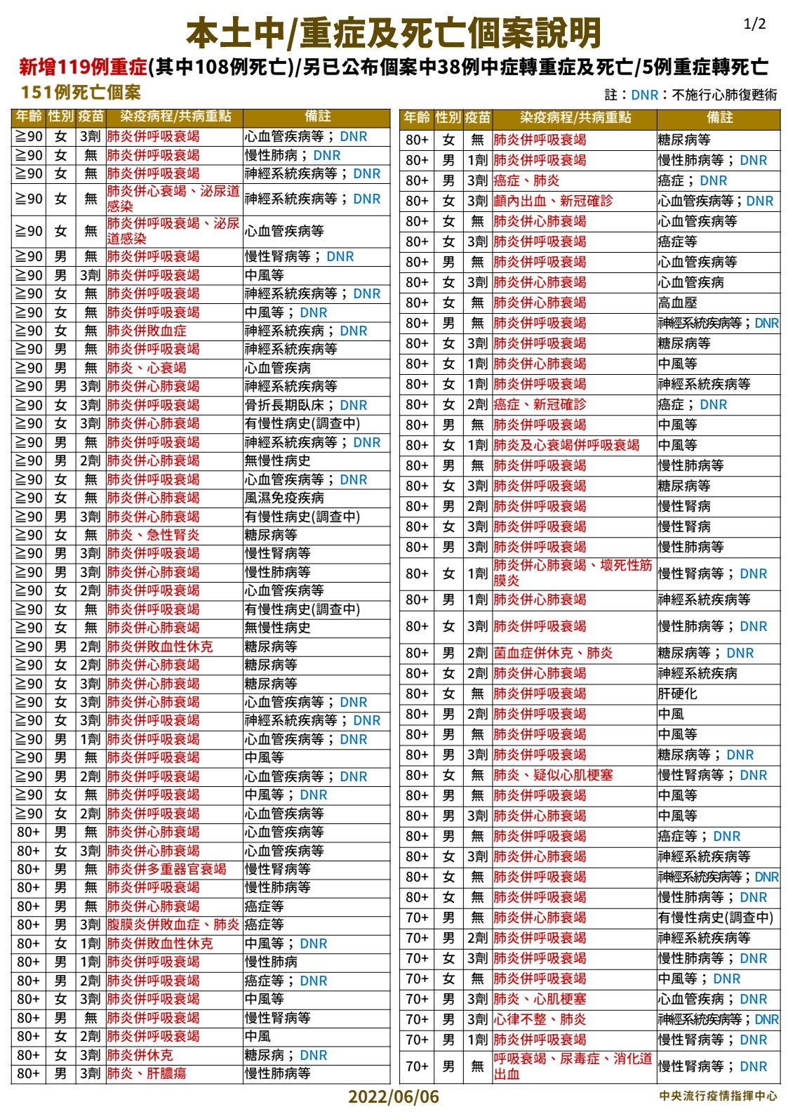 指揮中心指出,今日新增151例本土病例死亡個案,為84例男性、67例女性,年齡介於未滿10歲至90歲以上,皆屬重度感染個案、146例具慢性病史、64例無疫苗接種。確診日介於今(2022)年4月22日至6月4日,死亡日期介於5月14日至6月3日,詳如新聞稿附件。