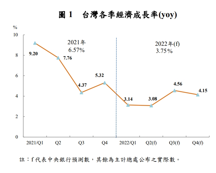 央行進一步指出,展望下半年,全球景氣擴張力道減緩,惟新興科技應用及數位轉型商機延續,可望支撐台灣出口動能,加以民間投資持續成長,政府支出增加,且若國內疫情趨緩,民間消費可望逐漸回升。本行預測本年經濟成長率為3.75%,低於3月預測值之4.05%。