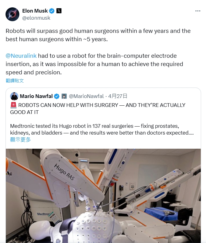 馬斯克在回覆諾法爾的貼文中表示,「機器人將在幾年內超越優秀的人類外科醫生,並在大約5年內超越最好的人類外科醫生。」