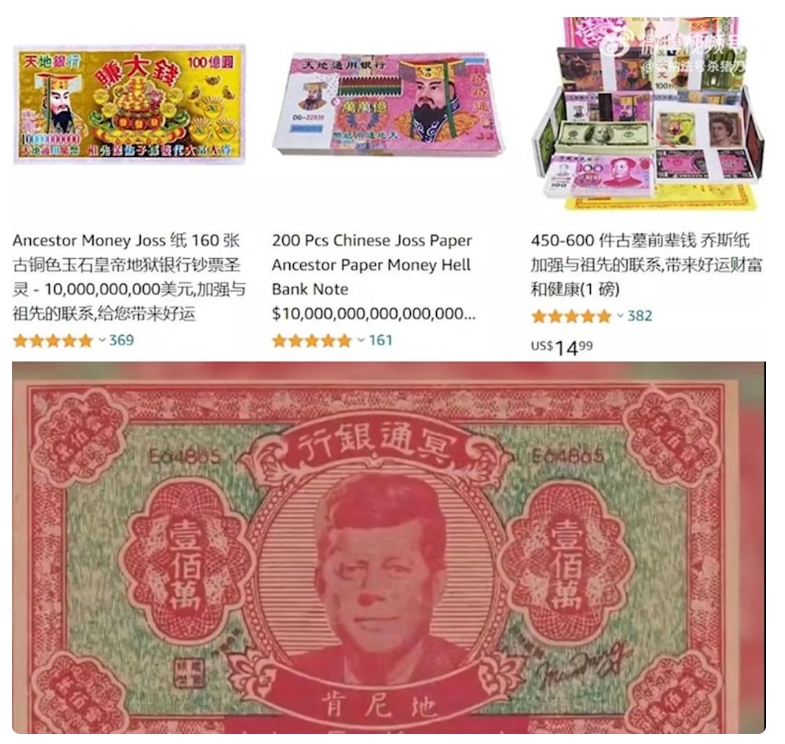 ▼外國電商平台販售各式祖先幣,可見美元版等本土化的冥幣。(圖/翻攝微博)