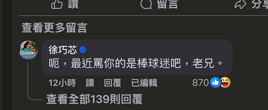 貼文發布後儘管出現許多大罷免支持者留言支持曹興誠,不過被曾興誠稱為「惡公僕」的徐巧芯也在留言區提及曾興誠於18日的「假球說」回應,「呃,最近罵你的是棒球迷吧,老兄。」吸引870名網友點讚,意外成為本篇貼文按讚數最高的留言。