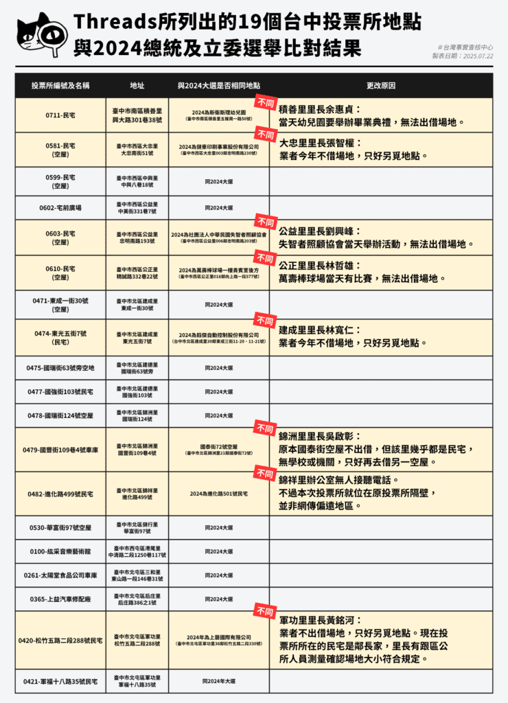 本月21日起,Threads平台熱傳兩篇「台中怪奇投票所」文章,點名多處投票所設於民宅、空屋或車庫,引發質疑是否「選前出奧步」。台中市議員江肇國也發文批評市府「投票所地點來不及改了」,呼籲民眾到場監票。