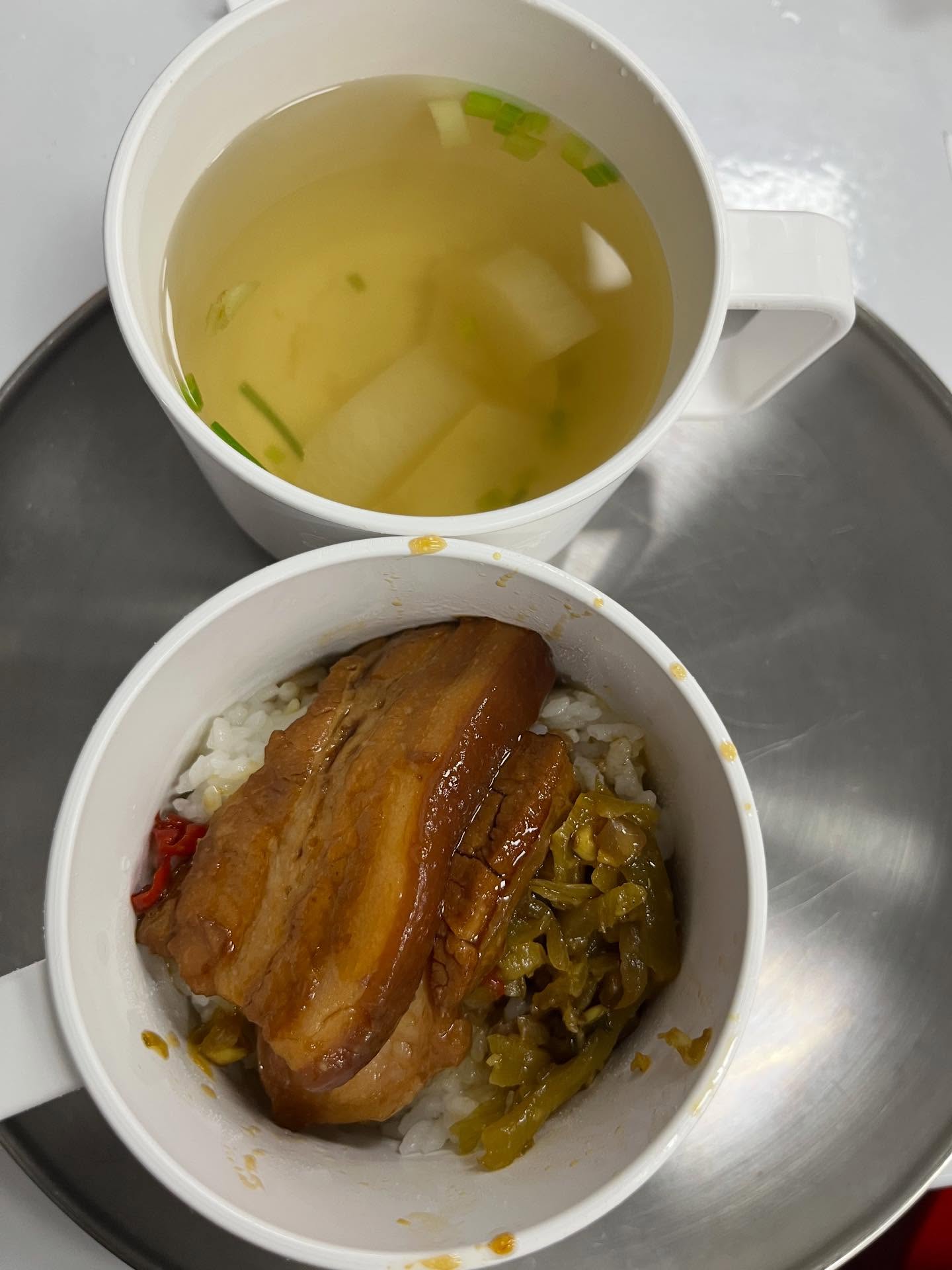 從網友分享的照片來看,焢肉飯跟蘿蔔湯都是紙盒盛裝,焢肉有兩塊而且肥瘦分明,飯也淋上濃郁的滷汁,湯品也真的撈的到蘿蔔,不像外面有些便當店只提供清湯,整體算是很有誠意。