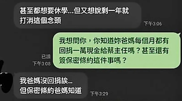 根據A老師提供的對話截圖,他曾詢問一名特教生:「我想問你,你知道你爸媽每個月都有回捐1萬現金給蔡主任嗎?甚至還有簽保密條約這件事嗎?」特教生答:「我爸媽沒回捐誒…但保密條約爸媽知道。」