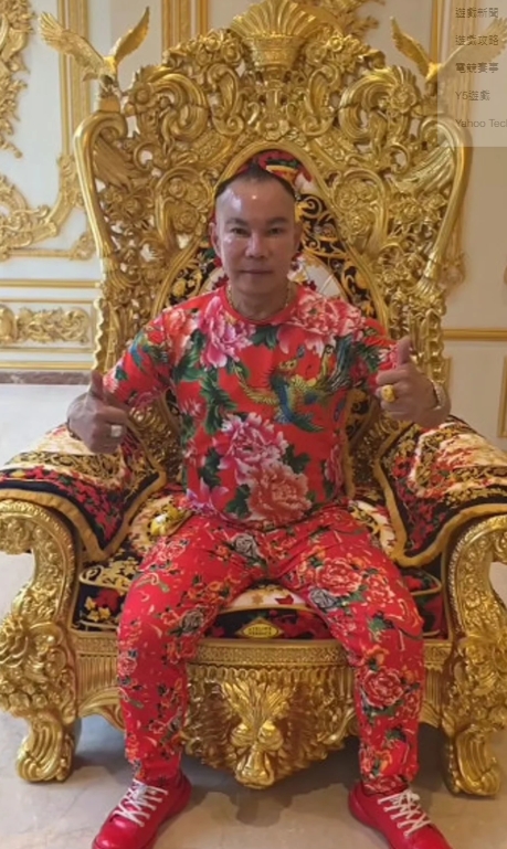 ▼胡漢龑坐在霸氣的金色座椅拍照。(圖/翻攝臉書粉專@翻攝啟德機械起重工程-股公司)
