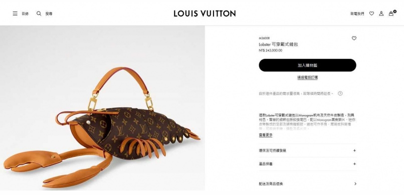 LV(路易威登)是法國奢侈品牌,以不斷推出新款設計、限量商品和聯名系列聞名,不過有時候也讓消費者看不懂。近日就推出一款龍蝦造型新品「LOBSTER」(龍蝦)手提包,外型十分獵奇,售價為55500元人民幣,掀起網友熱議。